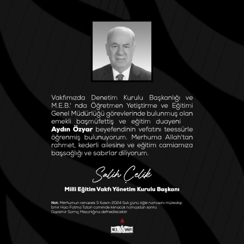 Vakfımızda Denetim Kurulu Başkanlığı ve M.E.B.'nda Öğretmen Yetiştirme ve Eğitimi Genel Müdürlüğü görevlerinde bulunmuş olan emekli başmüfettiş ve eğitim duayeni Aydın Özyar beyefendinin vefatını teessürle öğrenmiş bulunuyorum.